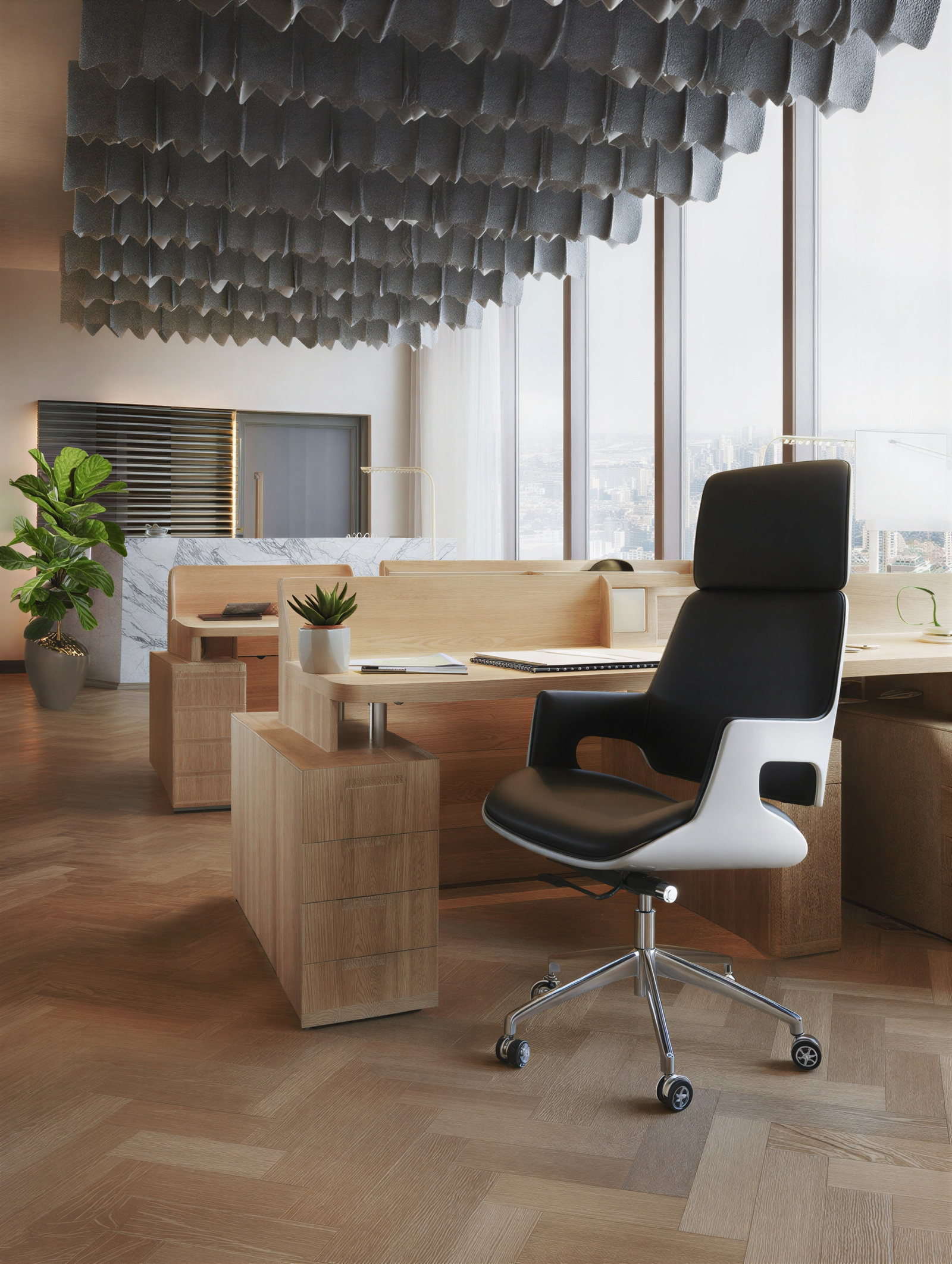 Sa structure interne en bois multiplis et son piètement en aluminium Ø330 mm garantissent une excellente stabilité et une longue durée de vie. Le vérin à gaz classe 3 électroplaqué assure des réglages fluides et fiables, une rotation douce à 360° et une résistance éprouvée à l’usage intensif quotidien. La mousse haute densité (≥ 45 kg/m³) conserve sa forme et son confort même après plusieurs années d’utilisation.