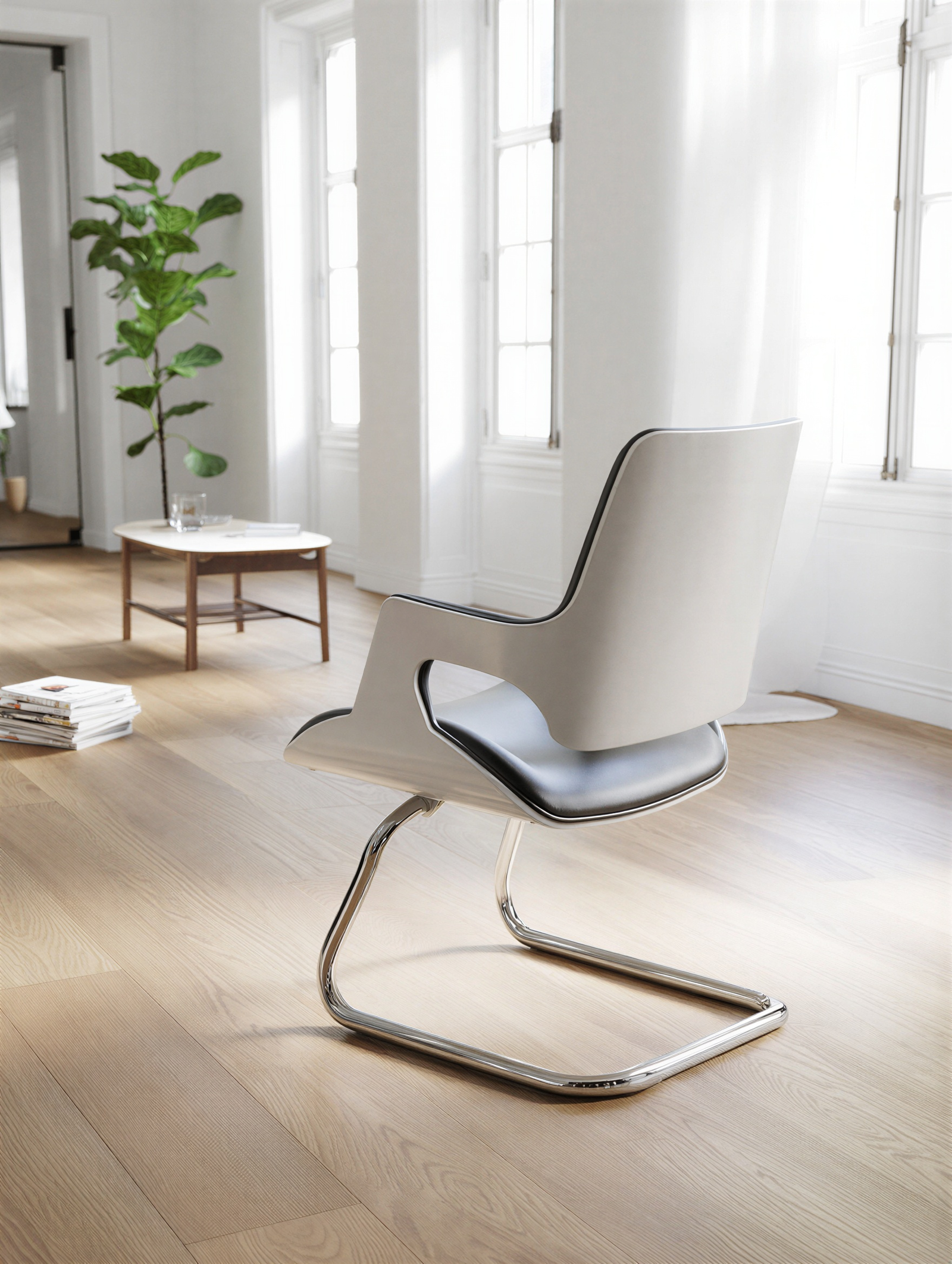 Sa structure tubulaire chromée à paroi épaisse de 2,0 mm offre une résistance supérieure à l’usage quotidien intensif — plus solide et plus stable que les structures standard du marché. La structure interne en bois multiplis et la mousse haute densité (≥ 45 kg/m³) conservent leur tenue et leur confort dans le temps, pour une longévité exemplaire. Les patins anti-rayures protègent efficacement tous types de sols et facilitent les déplacements du siège.