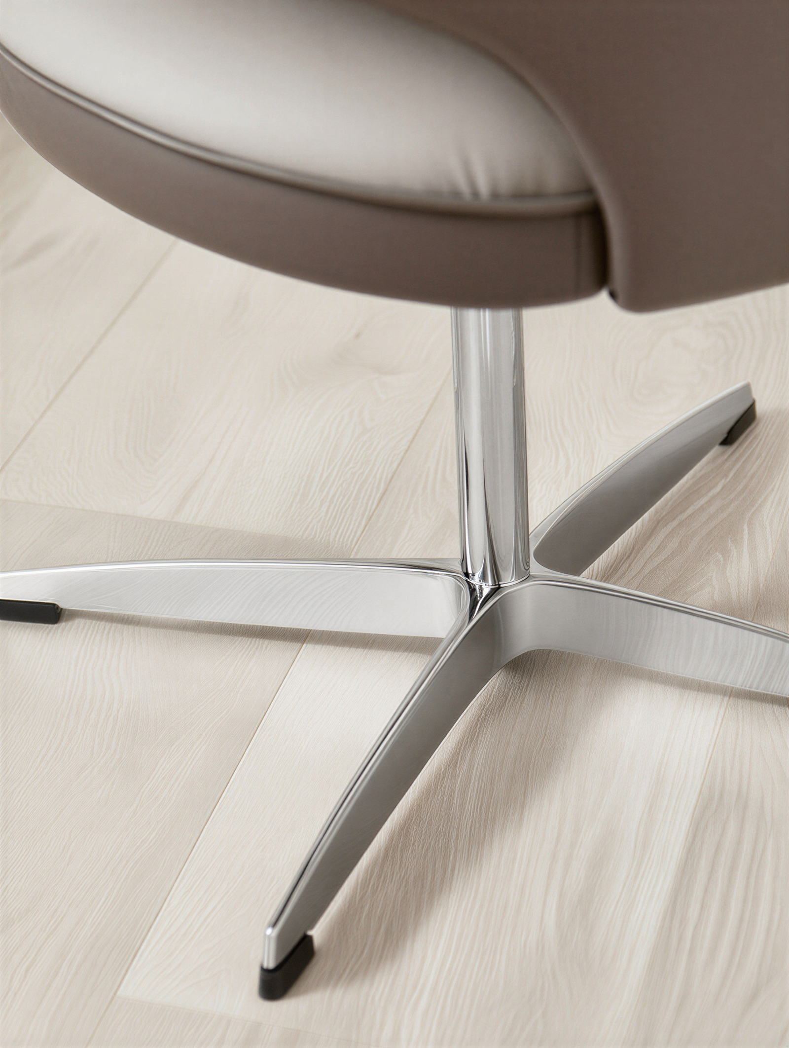 Son piètement étoile à 4 branches en aluminium chromé offre une stabilité parfaite sans roulettes, tout en permettant une rotation fluide à 360°.
