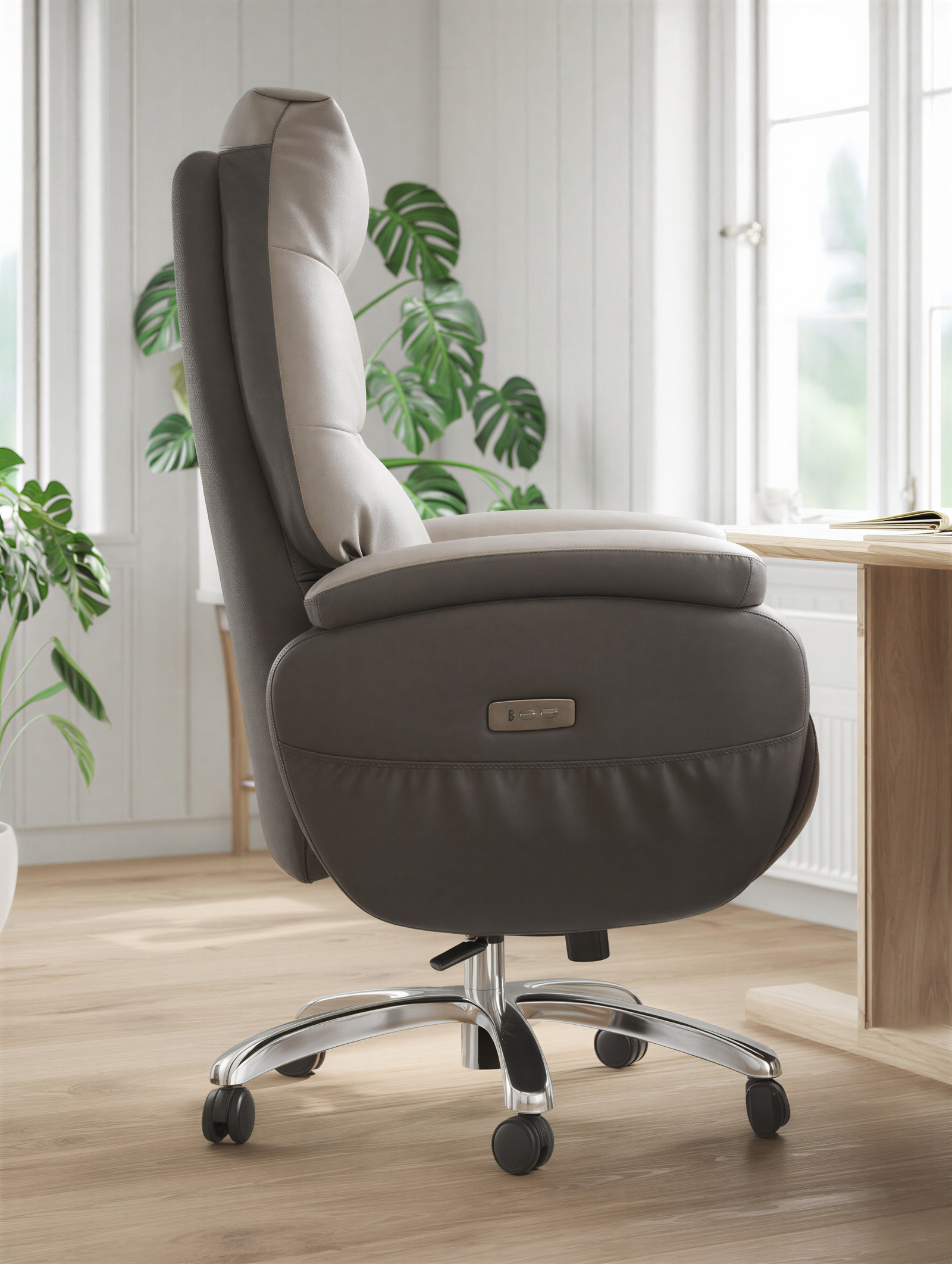 Le dossier haut galbé soutient efficacement le dos et les épaules, tandis que le mécanisme multifonction manuel permet d’adapter précisément la hauteur, la tension et l’inclinaison à chaque utilisateur. Le revêtement en cuir véritable bicolore — beige clair et taupe — confère à L’Impérial une personnalité unique et une élégance rare dans l’univers du mobilier de bureau professionnel.