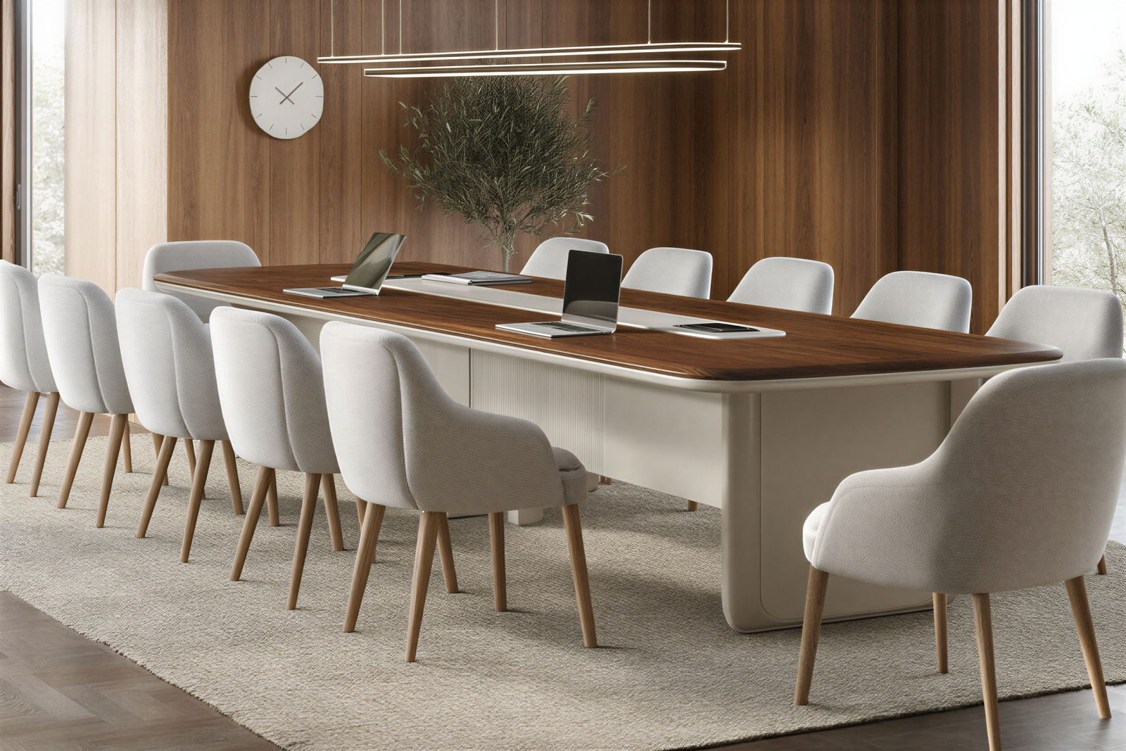 Idéal pour : les salles de réunion de direction, espaces de conférence et de conseil, zones collaboratives premium et cabinets ou sièges sociaux recherchant une table signature valorisant l’image du leadership, pour des salles de 20 à 40 m².